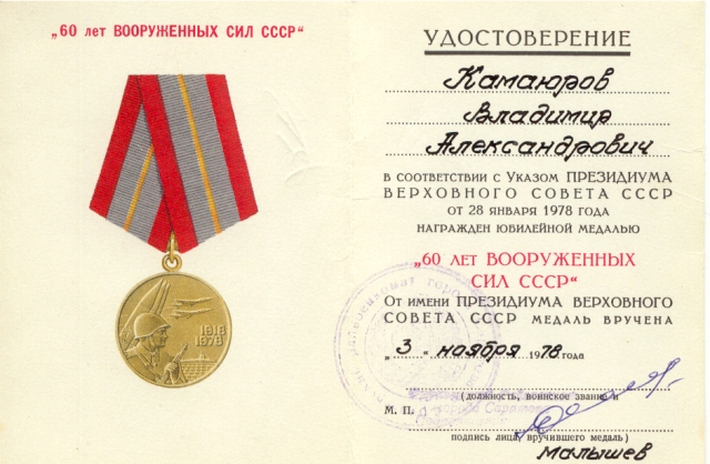 Удостоверение к медали "60 лет Вооруженных сил СССР"