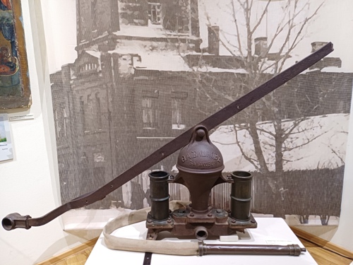 Пожарный насос, изготовленный в конце XIX в., поступил на выставку из Музея истории города Балаково. Его разработал Ф.А. Блинов – механик-самоучка, предприниматель, по одной из версий, создавший в 1896 г. первый в мире трактор на гусеничном ходу. В 1887 году на его заводе в Балакове был организован серийный выпуск пожарных насосов собственной конструкции. Представленный насос был обнаружен сотрудниками музея в 1993 году на пустыре у села Большая Сакма Балаковского района в ходе историко-бытовой экспедиции.